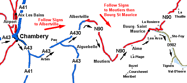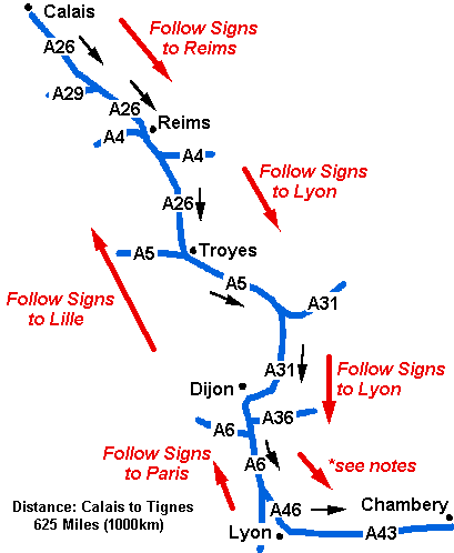 General: This is the usual route people use to get to Val d'Isere. The driving time is approximately 10 hours. The majority of the journey is normally quite quick, however the last step of the journey ,up the mountain from Bourg St Maurice to Val d'Isere, can take up to an hour. *note: before you get to Lyon, take the right turning (A46) Signed "Marseilles Geneva Grenoble Lyon-Est" (it does not say Chambery). Continue on for quite a few miles following the signs for "Marseilles Grenoble Lyon" until you get to a Chambery signs then continue onto Chambery. You will have to stay alert - you will change motorways frequently. Stop Overs: Depending on how far you have driven to get to Calais, you may find Troyes, Dijon or Chambery a good places to stop for the night. Boulogne: From Boulogne - follow the signs to St Omer (N42). Just before reaching St Omer you get onto the A26 to Reims. On your return it is signposted Boulogne. Note: the journey distance is about the same as that from Calais. |